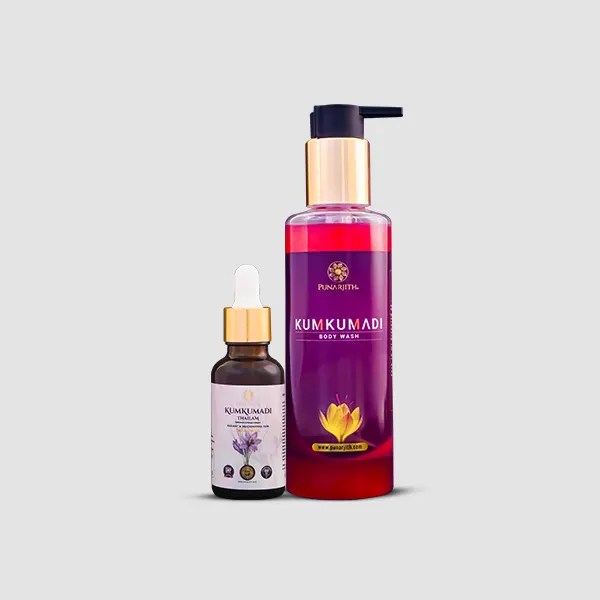 Experience the Punarjith Kumkumadi Tailam & Body Wash Combo, a luxurious blend of 100% Ayurvedic ingredients crafted in Kerala to nourish, cleanse, and enhance your skin’s natural beauty. Infused with pure Kashmiri saffron, sandalwood, vetiver, and other powerful herbs, this combo helps brighten skin, reduce blemishes, hydrate deeply, and maintain a youthful glow. The Kumkumadi Body Wash gently cleanses without stripping moisture, while the Kumkumadi Tailam Face Glow Oil rejuvenates and protects, leaving your skin soft, smooth, and radiant.