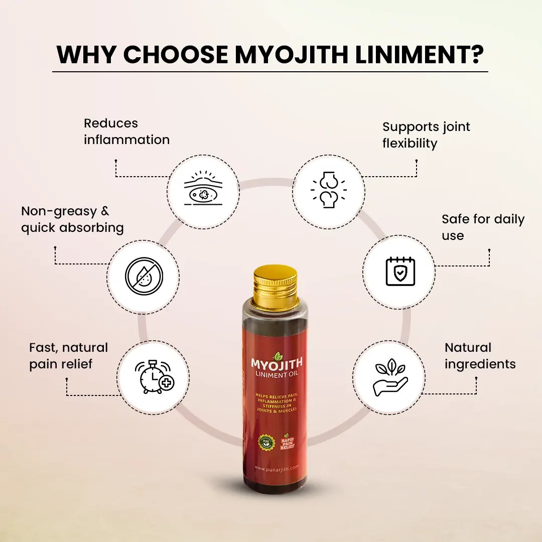 Myojith Liniment Oil is made with 100% natural Ayurvedic herbs and is generally safe for external use. Do a patch test if you have sensitive skin or allergies.